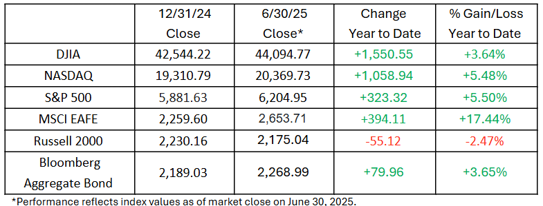 Equity markets continued to march higher in June, seemingly unfazed by heightened Middle East tensions (which were short-lived) and the looming July 8 deadline for the administration’s pause on reciprocal tariffs. Despite an interim bout of volatility, it was a record-breaking month for the S&P 500 and the tech-heavy NASDAQ as both indices ended the month with new all-time highs. The Dow Jones Industrial Average was up 4% for June.